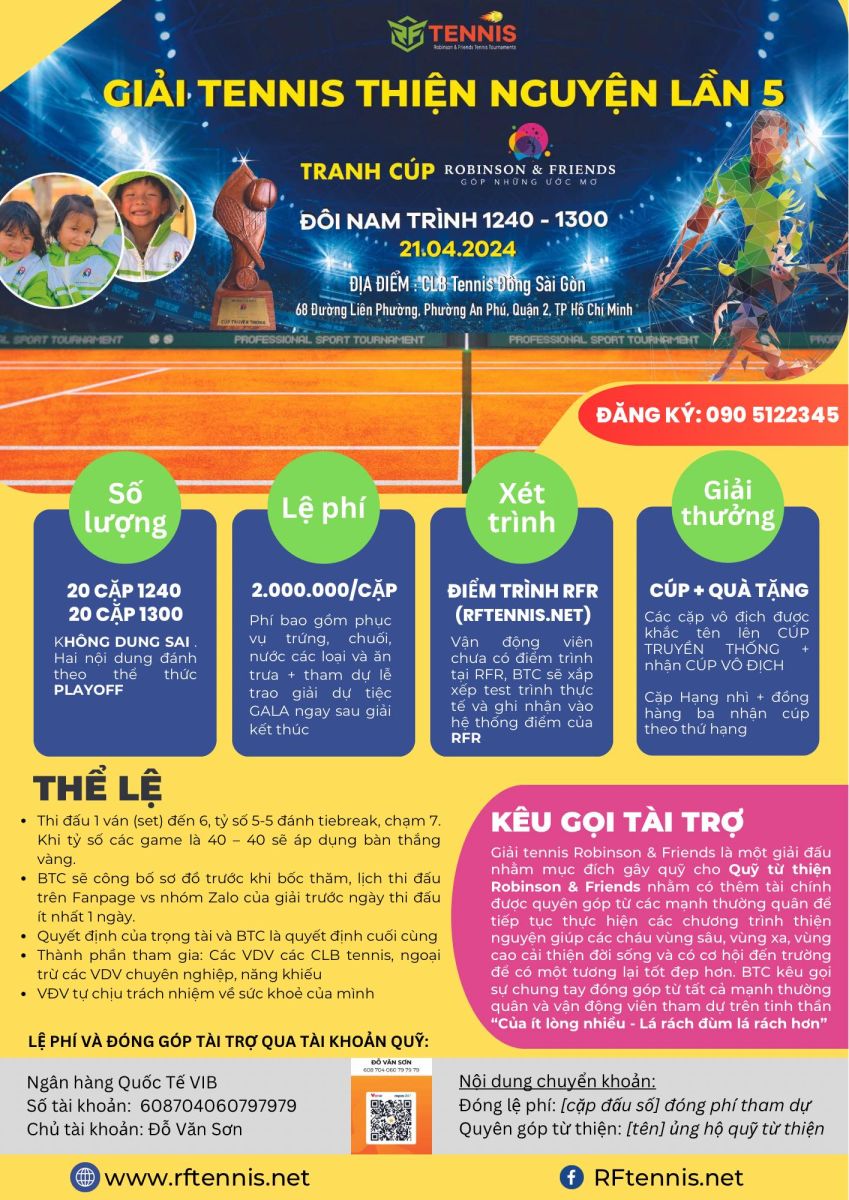 BTC giải tennis thiện nguyện do Quỹ Thiện Nguyện Robinson & Friends đồng tổ chức xin trân trọng thông báo tổ chức giải lần 5, diễn ra ngày 21/04/2024 tại CLB Tennis Đông Sài Gòn.